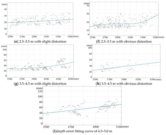 Fitting curve of the depth error at different ranges of depth.