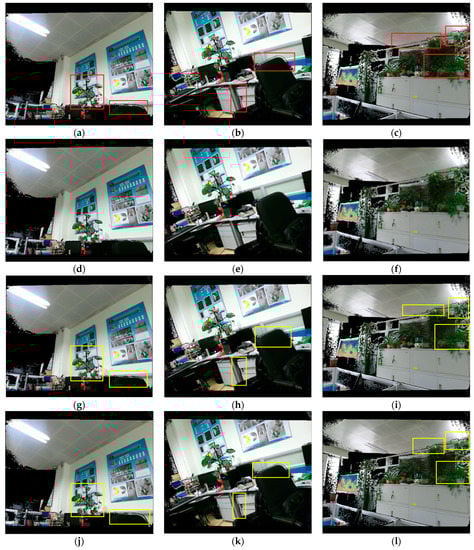 Registration results in different scenes: registration results of different scenes obtained by our method (d–f); the corresponding results of [56] (a–c); registration results obtained by using the calibrated rotation angles in our model and the translation components of [56] (g–i); registration results by using the rotation angles of [56] and the translation components in our model (j–l).