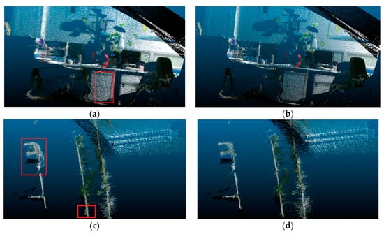 In order to quantitatively verify the correction model of depth, we selected the scene shown in Figure 12a for quantitative analysis. We applied Kinect-2 to reconstruct the scene in different depths and calculated the depth error before and after depth correction. We accurately measured the sizes of actual objects with regular shape in our lab, such as the width or height of the cabinets. Then, we measured the sizes of the same objects in the 3D point cloud before and after depth correction at different distances. The sizes of objects in the scene were measured several times before and after depth correction, and the averages were calculated. Then, the average errors were calculated by comparing with the actual sizes of objects and are shown in Table 4. It was easy to find that the performances of 3D reconstruction greatly improved after depth correction when the depth values were greater than 2.0 m. The errors were reduced by about 42% on average. However, the effect of depth correction was hardly obvious when the depths were less than 1.5 m. Based on previous research studies on the depth measurements of Kinect-2 [55], we concluded that the reason was that Kinect-2 was based on the principle of ToF to measure depth, and it had minor depth errors at close range and obvious errors at far distances.