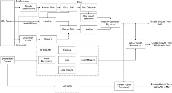 The proposed model for indoor localization using IMU sensor and smartphone camera-based system is shown in Figure 1. In the proposed model, different localization approaches are fused with the sensor fusion frameworks. The proposed model is divided into three steps. Locating user position using IMU sensor is the first step of the proposed model. In IMU-based localization, the position is estimated by step length and heading information. The complementary features of accelerometer, gyroscope and magnetometer sensors are used for position estimation. In the second step, we use a smartphone camera for localization. The smartphone camera captures the experiment area and the captured data used in the ORB SLAM algorithm for position estimation. To improve the camera based localization, we used an UcoSLAM algorithm with ArUco markers. In the last step, we combine the position results from IMU and camera based systems with a Kalman filter. The sensor fusion framework uses a linear Kalman filter for combining position results from IMU and camera.