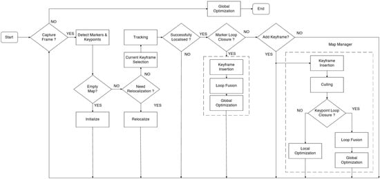 The UcoSLAM follows the same procedure used in the visual SLAM approaches for camera pose estimation. The main difference in the UcoSLAM approach is the combined use of keypoints and ArCuo markers for tracking and relocalization. The UcoSLAM system contains a map of the environment which is created and updated every time a new frame is available to the system. The UcoSLAM starts with map initialization. For map initialization, it uses homography, fundamental matrix (using keypoints) [86] and one or several markers [119]. After the map initialization in UcoSLAM, the system starts tracking or relocalization. If the system determines the camera pose in the last frame, it tries to estimate the current position using the last one as a starting point. In the UcoSLAM system, it uses the reprojection errors of keypoints and marker corners for tracking. For tracking in the UcoSLAM system, a reference frame is selected as map keyframe before tracking and map keyframe contains common matches to the frame analyzed in the previous time instant. After the tracking process, the system searches for the loop closures caused by ArCuo markers. If a loop closure is detected, then the system follows the keyframe insertion, loop fusion and global optimization steps as shown in Figure 2. If the loop closure is not detected, the system uses the map manger block, which runs the culling process when a new keyframe inserted. The culling process helps to maintain the map size manageable by removing the redundant information in the map. After the culling process, the system checks for the keypoint loop closure. If the keypoint loop closure is not detected, the system performs local optimization to integrate the new information. If the keypoint loop closure is detected, the system follows the loop fusion and global optimization steps. If the tracking process in the system failed in the last frame, then the system uses the relocalization mode. In the relocalization mode, it checks the markers already registered on the map. If the relocalization mode is unable to detect the known markers, it uses the bag-of-words (BoW) [120] process. For more details on UcoSLAM refer to [11].