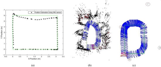 Indoor localization. (a) IMU-based localization. (b) ORB-SLAM localization. (c) UcoSLAM localization.