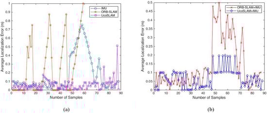 Figure 6a shows the average localization error results from IMU, ORB-SLAM and UcoSLAM based localization approaches. The maximum error from IMU-based localization approach is 0.7528 m when compared to the ground truth values. The ORB-SLAM localization approach gives 1 m localization error when compared to the reference path. The UcoSLAM localization approach shows a maximum of 0.5120 m when compared to actual values. Figure 6b shows the average localization error results from the proposed hybrid localization systems. The proposed hybrid systems show reasonable localization accuracy when compared to the true position values. From the average localization error results, the proposed hybrid localization approaches improved the localization accuracy when compared to the independent localization approaches. Table 2 shows the performance analysis of different localization approaches.