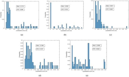 Probability distribution of localization errors. (a) IMU-based localization. (b) ORB-SLAM localization. (c) UcoSLAM localization. (d) ORB-SLAM + IMU. (e) UcoSLAM + IMU.