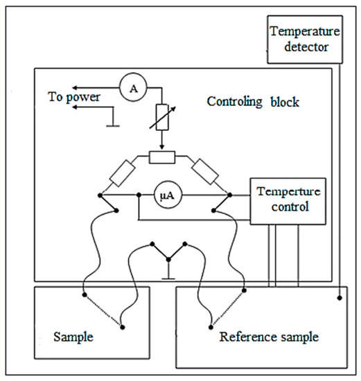 For property modification, the wires were annealed using furnace heating and Joule heating by DC current. The latter is of interest for the formation of the induced anisotropy by a circular magnetic field of the current. The sample length for current annealing was 15 cm, the passed current amplitude varied in the range of 25–90 mA, and the flowing current time varied within up to 60 minutes. All the current treatments were performed in the same ambient conditions. During current annealing, the temperature control is of high importance, since the annealing temperature should be sufficiently high to ensure fast kinetics but not exceed the Curie temperature. One method to measure is to make a comparison between the dependences of the saturation magnetization on the temperature and annealing current [23]. The value of can be also found from modeling, considering the balance between the supplied electric power and heat exchange [46]. We have recently proposed a direct method of measuring the temperature during current annealing, which is based on using a reference sample, the temperature of which is automatically set equal to the temperature of the annealed microwire. The setup uses a precision operational amplifier with a bridge switching circuit and a heating platform, as demonstrated in Figure 1.