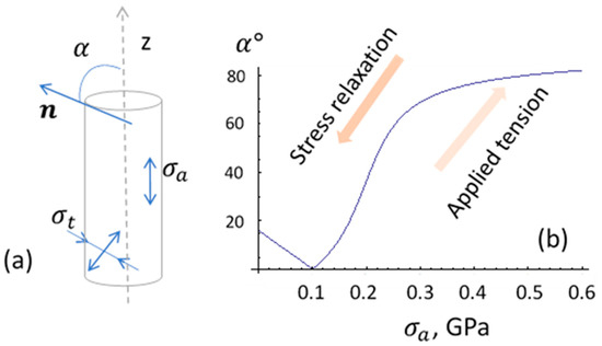 Figure 2. In (a), schematic representation of various stress contributions to the easy anisotropy of amorphous wire; in (b), dependence of the angle between the easy axis and the wire axis z on tensile stress . Parameters used for calculation: , , and . In order to describe a smooth transformation in the easy angle , a small torsion stress was introduced. - Annealing in the presence of a magnetic field forms in wires a certain combination of anisotropy and magnetostriction due to atomic pair ordering, internal stress relaxation, and atomic rearrangements [52,53]. The microscopic origins of the induced anisotropy and transformation in magnetostriction are different, and their evolution during annealing may not correlate [24,27]. Recently, researchers demonstrated the possibility of inducing a circumferential anisotropy in combination with a positive magnetostriction in Co-rich amorphous wires [16]. Depending on the magnitude of the magnetostriction constant, the applied tensile stress may cause non-monotonic change in the easy anisotropy angle, as shown in Figure 3 (Curve 1). For higher values of magnetostriction, the application of tensile stress establishes the axial anisotropy (Figure 3, Curve 2).