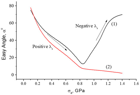 In Equation (3), is the magnetostriction in the stress-free state, and the parameter is positive and rather small, residing in the range of /MPa. However, if is also small, the second term in Equation (3) may be critically important: with increasing , the negative contribution to increases, which may result in a sharp change in the direction of the easy anisotropy. The possibility of transforming the type of magnetic anisotropy through changing the easy axis direction constitutes the basis of the development of highly sensitive sensing elements with respect to mechanical stresses.