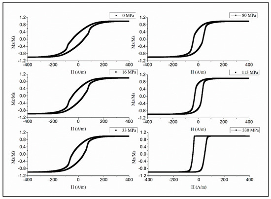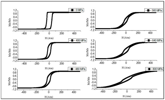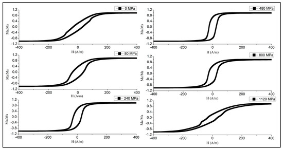 The established magnetic configuration responds sensitively to the application of the tensile stress as shown in Figure 6 and Figure 7. The combination of positive magnetostriction and tensile stress enhances the axial easy anisotropy, which is evident from a gradual increase in the remanence/saturation ratio. In the case of Figure 6 (), sufficiently high causes the reverse transformations, and the loop becomes inclined when the stress exceeds this value. Therefore, the anisotropy easy-axis tends toward circumference. Such stresses are sufficient to change the magnetostriction sign according to Equation (5), and coupled with a negative magnetostriction strengthens the circumferential anisotropy. For higher (Figure 7), the magnetostriction gets larger values due to annealing, so the external stress up to very high values—more than those of the GPa—cannot change the sign of the magnetostriction. In this case, the loop becomes a perfectly rectangular shape. The observed transformation in the anisotropy easy-axis corresponds to the modeled results of Figure 3.