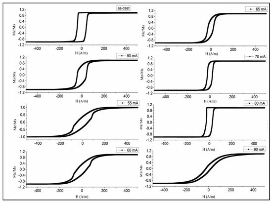 Effect of current intensity during annealing on the hysteresis loops of glass-coated amorphous Co71Fe5B11Si10Cr3 microwires (50 mA corresponds to a current density of 102 A/mm2 for the wire diameter of 25 microns).