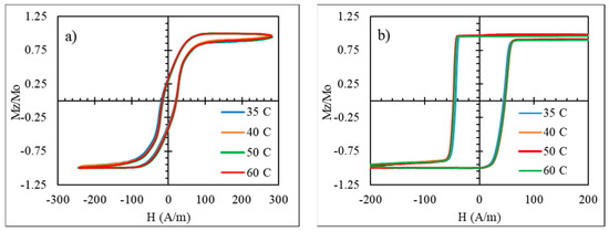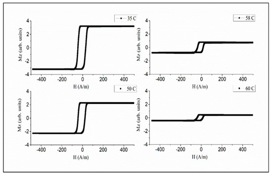 To realize temperature-dependent magnetic properties in the moderate range from the room temperature 50 to 80 ℃, amorphous microwires with a reduced Curie temperature are of interest. The wires of the amorphous alloy system Fe3.9Co64.82B10.2Si12Cr9Mo0.08 having values of 62 ℃ were chosen considering their rectangular hysteresis, which preserves its shape up to , as shown in Figure 8 [71]. This behavior is related with relatively large and positive magnetostriction (, so some internal stress relief is not critical. A well-defined axial anisotropy exists for any temperature , which is quite important for applications based on fast magnetization switching.
