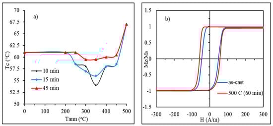 Effect of annealing on the Curie temperature and hysteresis loops for amorphous Fe3.9Co64.82B10.2Si12Cr9Mo0.08 microwire (in as-prepared state 61.5 ℃). In (a), vs. annealing temperature for different annealing times; in (b), the hysteresis curves in the as-prepared state and after annealing with a high annealing temperature of 500 ℃.