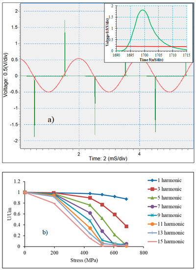 Figure 10 demonstrates the voltage pulse generated from remagnetizing the as-produced microwires of the composition Co71Fe5B11Si10Cr3 along with the amplitudes of high harmonics. The magnetic behavior of this wire is characterized by a rectangular hysteresis, as shown in Figure 4. The application of a tensile stress high enough to change the easy anisotropy direction tilts the hysteresis curves, and the harmonics amplitudes decrease with increasing ; moreover, higher harmonics decrease faster [73] (Figure 10b). This means that the ratio of harmonics amplitudes can be used as sensing parameter, which may not depend on a particular technical configuration.