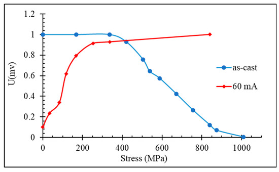 Effect of tensile stress on the amplitude of 11th harmonics of glass-coated amorphous Co71Fe5B11Si10Cr3 microwires in an as-prepared state and after current annealing at 60 mA (122 A/mm2) for 60 min (compare with the change in the hysteresis curves shown in Figure 7).