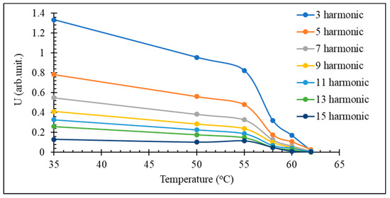 For amorphous microwires that preserve the rectangular hysteresis in the vicinity of the Curie temperature, the harmonics’ amplitudes decrease sharply when approaching the Curie temperature, as shown in Figure 14. The most sensitive temperature range of the spectrum variation is near the Curie temperature where the magnetization starts to drop. In the case of a Fe3.9Co64.82B10.2Si12Cr9Mo0.08 microwire having 61.5 ℃, this range is within 55–61 ℃. Since the Curie temperature can be fine-tuned by annealing and alloy composition, this temperature range is adjustable to suit particular applications. Thus, for composite curing, higher temperatures in the range of 150–200 ℃ are needed, and for biomedical applications such as controlling the temperature at hyperthermia treatments, a narrow temperature range of 40–45 ℃ is of interest.