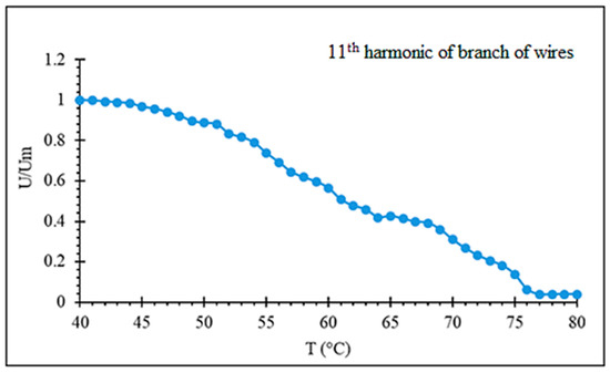 The temperature range where the harmonic spectrum varies with increasing temperature may be widened using a number of wires with different Curie temperatures. Figure 15 demonstrates a near linear decrease in the amplitude of the chosen harmonics with increasing temperature in the range of 40–75 ℃.