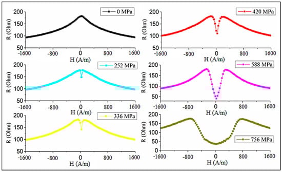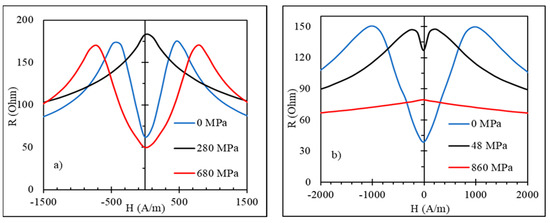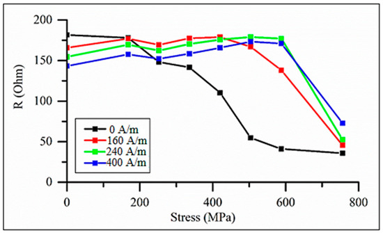 Initially, the impedance has a maximum at and with increasing values, it splits into two peaks, which reflects the change in the easy anisotropy direction (from axial to circumferential) as the magnetostriction becomes negative. Then, for small fields, the impedance monotonically decreases with increasing , although the sensitive change in occurs for higher stresses, as shown in Figure 17. When measuring the impedance, the load was applied in the middle of the wire, and the imposed stress is nonuniform along the length. On the other hand, a uniform stress was applied to the wire during the hysteresis loop measurements. This difference explains some quantitative disagreement, but the trend in the impedance and hysteresis loop transformations under the effect of tensile stress is consistent. The largest variation in impedance occurs when no external field is applied: the relative change is nearly 100% in the range of 200–600 MPa. The application of the field increases the insensitive range with respect to , since the axial field helps to hold the magnetization along the axis.