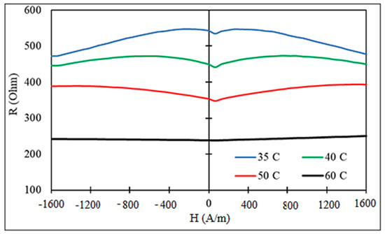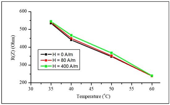 A strong change in impedance can be expected near the Curie temperature where both the magnetization and effective anisotropy decrease. Owing to the decrease in and , the ferromagnetic resonance frequency ( is the gyromagnetic constant and is the effective anisotropy field) decreases near and the dispersion region of shifts to lower frequencies; therefore, the high-frequency properties are suppressed [69]. However, at low frequencies, the initial susceptibility increases when a temperature is approaching , since the effective anisotropy and . Then, at lower frequencies, the impedance may initially increase near but eventually will drop as the resonance frequency tends to zero. A non-monotonic behavior of the impedance when approaching was observed in [71] for frequencies lower than 100 MHz. For higher frequencies, the susceptibility decreases with temperature following the decrease in , and the impedance experiences a monotonic decrease, as demonstrated in Figure 19. It is seen that there is a very weak dependence on the magnetic field, since the magnetic susceptibility at high frequencies depends weakly on changing the field. Figure 20 shows the impedance versus temperature plots.