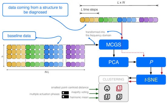 The structure of the paper is as follows: Section 2 describes the objective of t-SNE and how the plane or spatial representation is obtained. Section 3 includes how the baseline data are collected and pre-processed, how the global dimension of the data is reduced, and how the clusters are created using t-SNE. The damage detection and classification procedure of a structure that has to be diagnosed is presented in Section 4. The experimental case study is described in Section 5. In Section 6, the results are shown. Finally, in Section 7, some conclusions are drawn.