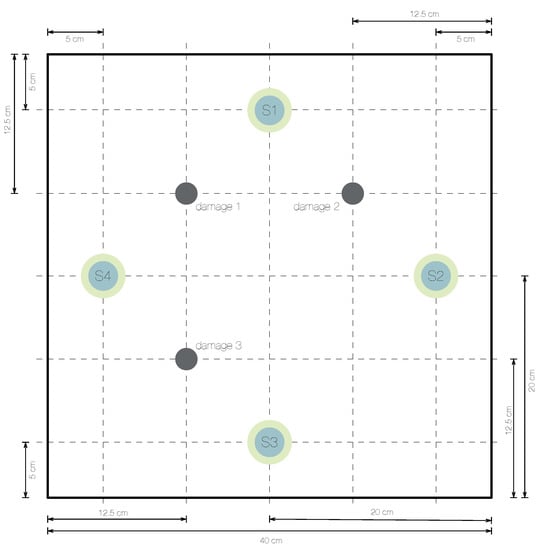 In this section, a square aluminum plate with an area of 1600 cm (40 cm cm, and a thickness of cm) and instrumented with four PZTs is considered to demonstrate the reliability of the damage detection and classification methodology introduced in Section 3 and Section 4. The piezoelectric transducer discs are attached to the surface and their location is shown in Figure 3. Assuming that the lower left corner of the plate in Figure 3 represents the origin of coordinates, the PZTs are installed at these positions (units in centimeters):