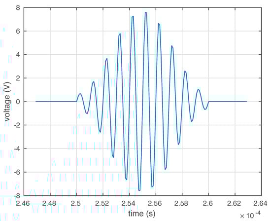 - Scenario 1. The signals are obtained using a short wire ( m) from the digitizer to the PZTs, and these signals are filtered with a Savitzky–Golay (SG) [] filter algorithm after adding white Gaussian noise. The filter is applied for the intention of smoothing the data.