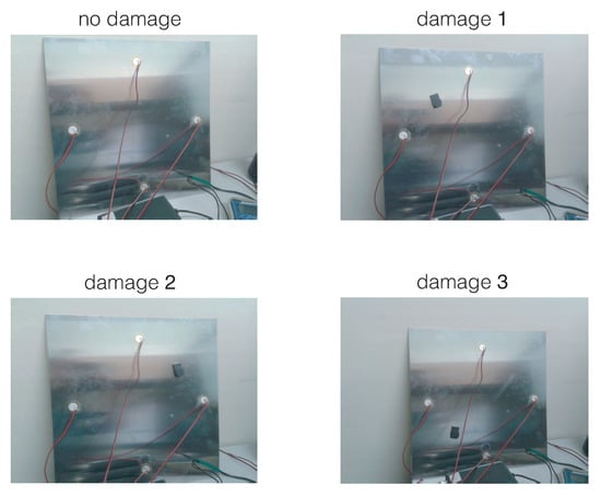 - the second, third, and fourth structural states correspond to the plate with an added mass at the positions indicated in Figure 3 as damage 1, damage 2, and damage 3, respectively.