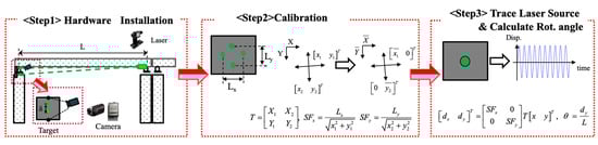 The rotational angle is calculated from the displacement obtained by image processing techniques [13]. The laser is firmly attached at the bottom of the bridge girder or a bridge deck at support. The target panel is installed at a bridge pier or an abutment on the other side, which is regarded as a fixed location. The target should be installed perpendicular to the laser beam. The distance between the laser and target can be pre-determined. The target size with four white spots can be determined by considering the actual size of target area, which can be traced by a camera with a telescopic lens. To convert the pixel information to actual displacement, a target image with four spots is captured. The horizontal and vertical lengths (Lx, Ly) can be determined by considering the maximum displacement of the laser source. A transformation matrix and scaling factors can be calculated using direction vectors and the actual size of the target. When a moving vehicle runs over the bridge, the support will rotate together with the attached laser pointer. The projected laser on the target can be traced by a camcorder, while the displacement can be calculated by the computed scaling factors and a transformation matrix. Finally, the rotational angle at the support can be calculated using the measured displacement divided by the distance from the laser source to target. The accuracy of the system was verified from laboratory tests [14] and field test [23]. In this system, the noise level for the distance up to 30 m is found to be around degree. The vision-based rotational angle measurement system and its application procedure are illustrated in Figure 1.