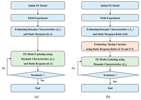 Flowchart for the FEMU methods. (a) The conventional FEMU method using modal and static data simultaneously and (b) the proposed FEMU method.