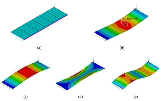 Numerical simulation using the FE model of the plate-girder bridge. (a) FE model of the test bridge; (b) static load analysis; (c) 1st bending mode; (d) 1st torsion mode and (e) 2nd bending mode.