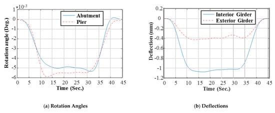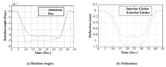 Rotation angles and deflections measurements of L.C. 2: validation data. (a) Rotation angles avg. value at the abutment bound = 3.92 × 10−3 deg. Avg. value at the pier bound = 4.66 × 10−3 deg. and (b) deflections: avg. value at the interior girder = 0.82 mm. Avg. value at the exterior girder = 1.03 mm.