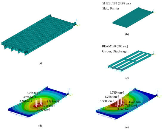 FE model of a pre-stressed bridge. (a) FE model of the test bridge; (b) shell element of the FE model; (c) beam element of the FE model; (d) Load Case 1 for calibration and (e) Load Case 2 for validation.