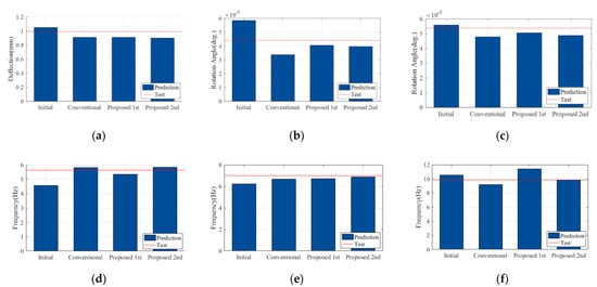 The proposed FEMU using sequential framework consists of two steps. In the first step, the rotational spring constants were estimated using the N.N. and measured ratio of the static data from the field experiment. The architecture of N.N. and splitting data are identical to those in the numerical verification. Based on the results from 10 repetitions, the best identified value and their summary statics were computed. The values of the rotational springs were identified as shown in Figure 10d–e with the C.V. less than 0.04. As shown in Figure 11, the updated FE model from the first step was not sufficient to represent the target static and dynamic behaviors yet. To improve the accuracy of the updated FE model from the first step, FEMU was performed using modal data to identify the updating parameters of the superstructures. In this step, the rotational spring constants were fixed to the identified value from each repetition. As shown in Figure 10, the C.V. of the relative stiffness ratios were computed between 0.14 and 0.44, which were less than those of the conventional FEMU method. This indicates that the proposed FEMU method improves the parameter identifiability the smaller C.V. than those of the conventional method. As expected, the updated value of the girder increases around 130% of the nominal value due to effects of the tendons. As shown in Figure 11, the relative errors of all target data are less than 10%. This indicates that the updated FE model from the proposed FEM method is better calibrated than that of the conventional FEMU method. Figure 12 compares the accuracy for the validation data (i.e., static responses of load case (2) from each method. The proposed FEMU method only provides less than 10% of the relative errors for the validation data. This indicates that the proposed FEMU method is much more reliable to improve the extrapolation predictions (validation data) than the conventional FEMU method.