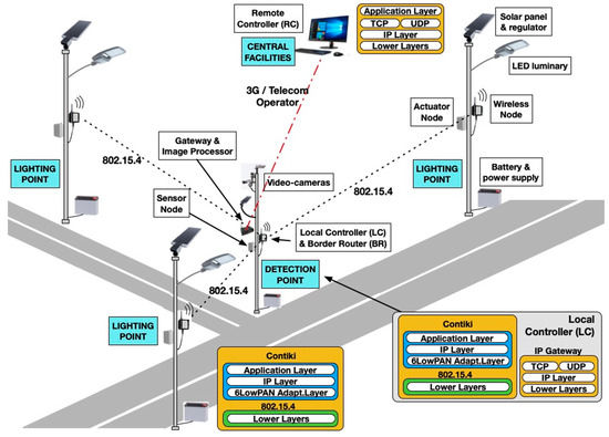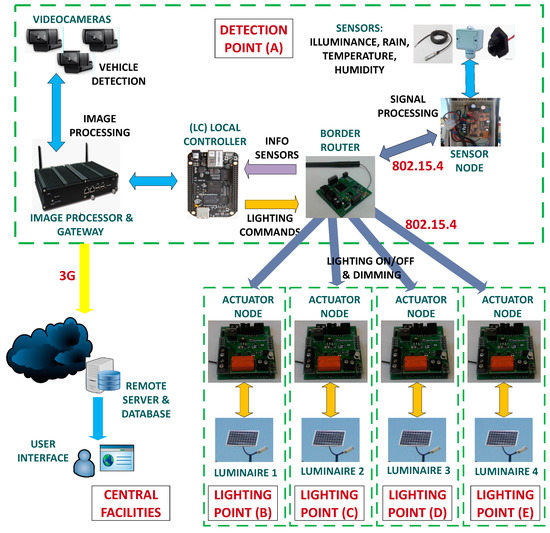 The development of a smart lighting system must address knowledge related to various technological fields: sensors, wireless communication, streetlights, renewable generation, and energy control and storage. To consolidate the diverse requirements of all these fields, the general architecture of Figure 1 was selected for ITERL. To build such a system, it is necessary to develop: