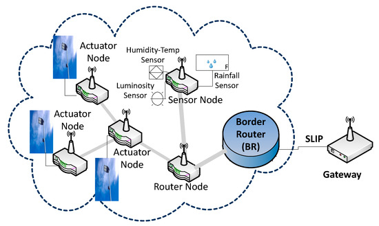 The network topology is shown in Figure 5. It is organized as an IPv6 subnet. At a functional level, the client-server communication paradigm was followed, so that end devices establish User Datagram Protocol (UDP) communication with the coordinator node, which also acts as a 6LowPAN border router (BR). Sensor nodes collect the ambient information (illuminance, ambient temperature, relative humidity, and rain). The coordinator node collects the data coming from sensor nodes and sends them to the communication gateway through a series connection, over which the serial line Internet protocol (SLIP) is implemented. Although a star topology could have been selected, the presence of a router allows that multiple intersections to be controlled in the future by the same local controller. At the actuation level, an actuator node is placed in each of the streetlights to control the illumination level.