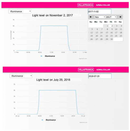 It is notable that Figure 8 illustrates the measured ambient illuminance graph for two different dates. Daylight duration can be determined so that the actuation over streetlights is performed when necessary (nighttime, sunrise, and sunset). For the dates in Figure 8: