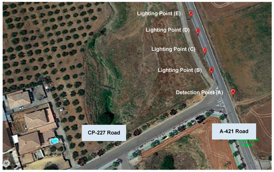 Implementation aspects such as the distance between detection, lighting points, and the intersection were selected according to national regulations and industry recommendations [19], under the supervision of experts from our industrial partner organizations and the administration. These values can be considered to be adequate for T-shaped intersections, such as that in Figure 9 with selected streetlights, although they should be carefully reconsidered for each new deployment.