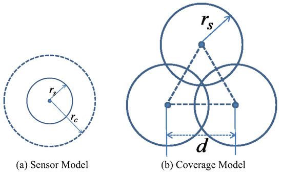 Both the sensing and communication ranges were assumed to be a disk, with radii of and , respectively: (a) sensor model; and (b) coverage model.