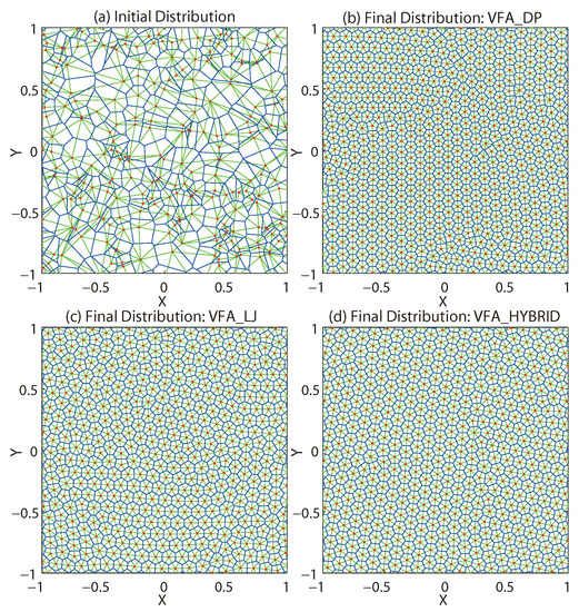 (2) A VFA based on virtual exchange force (Lennard–Jones Potential, the so-called VFA-LJ) was adopted to further improve the network topology [11,12]. The node positions from VFA-DP can be regarded as the initial deployment for the VFA-LJ. The corresponding velocity and the acceleration information were also used as the initial conditions at the first time step in the VFA-LJ calculation. The advantages of these two original physical force algorithms are merged.