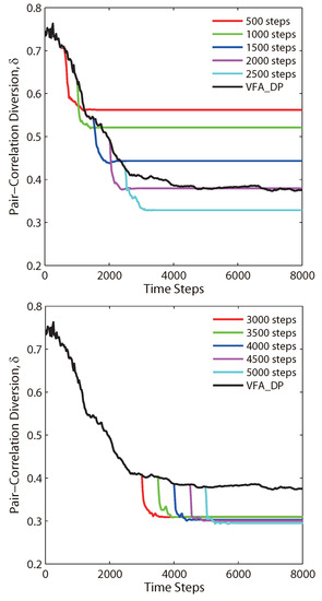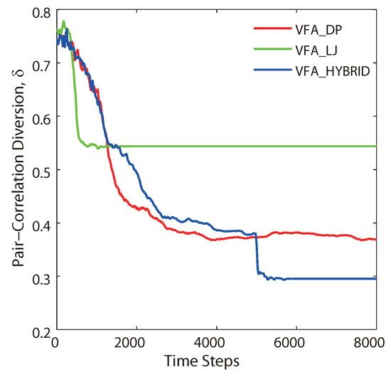 Performance evaluation profiles of the PCD as a function of the time step from VFA-LJ, VFA-DP and VFA-Hybrid algorithms, respectively.