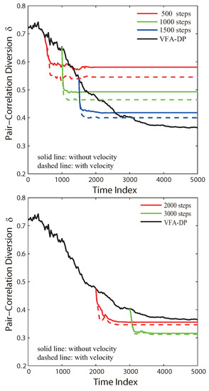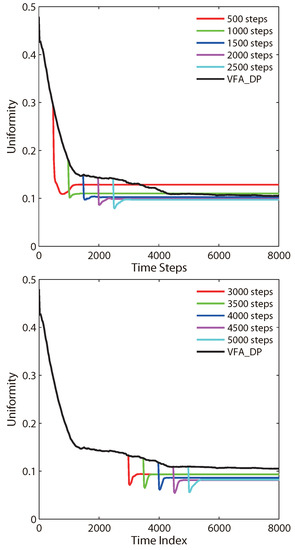Figure 6 shows the typical profiles of system uniformity for VFA-DP and VFA-Hybrid, as a function of time step obtained from Equations (8) and (9) for the specified switch time. Obviously, the uniformity of the whole network is further improved and the lower U-values are obtained when the virtual force of Lennard–Jones potential is adopted. It is also consistent with the results shown in Table 1 and Figure 2.