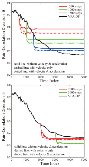 Figure 4 illustrates the performance evaluation profiles of the pair correlation diversion as a function of the time steps of the VFA-DP, VFA-LJ, and VFA-Hybrid algorithms, respectively, which correspond to the final distributions in Figure 2b–d. The lower PCD value indicates better hexagonal network topology. Based on the simulation results, the converged diversion value for the original VFA-LJ is approximately 0.55 after 800 time steps. On the other hand, the diversion value for the original VFA-DP is approximately 0.4 after 2100 time steps. It indicates that VFA-DP achieves better hexagonal network topology, which is consistent with Figure 2b. For VFA-Hybrid, the involved virtual force switched from Yukawa potential (Equations (1) and (2)) to Lennard–Jones potential (Equations (5)–(7)) at the 5000th time step without considering the node velocity and the acceleration. After the algorithm switching, VFA-Hybrid further improved the network structure and the corresponding PCD value is 0.3. As shown in Figure 2d, the VFA-Hybrid algorithm had best hexagonal distribution.