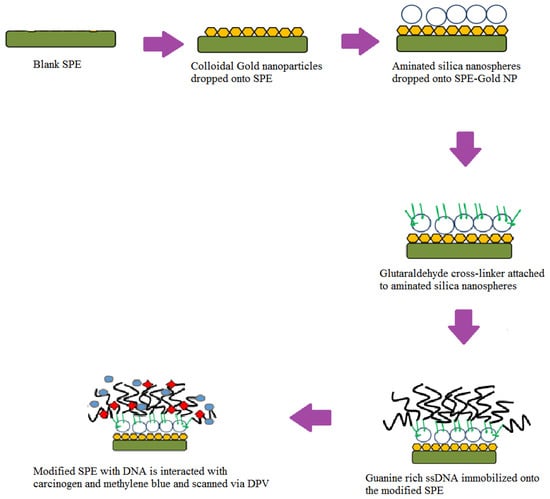 We dropped 15 µL of stock colloidal AuNPs (0.0167 µg/mL) onto a carbon based screen-printed electrode (SPE) and dried overnight. Next, 10 µL from 1.5 mg of aminated SNs that were suspended in 1 mL ethanol (98%) were dropped onto the SPE and dried under ambient conditions, followed by immersion in 10% glutaraldehyde for 1 h. The modified SPE was then immersed in 400 µL of guanine rich DNA (10 µM) overnight to ensure the amine-terminated DNA bonded covalently to aminated SNs via a glutaraldehyde linker. The modified SPE was then immersed in a carcinogen solution, followed by immersion in MB indicator. Finally, the SPE was washed to remove any unbound MB and DNA molecules before being scanned using DPV from −0.4 V to 0 V with a scan rate of 0.005 V/s in 0.05 M PBS (pH 7). Figure 1 illustrates the stepwise process to fabricate the DNA biosensor.