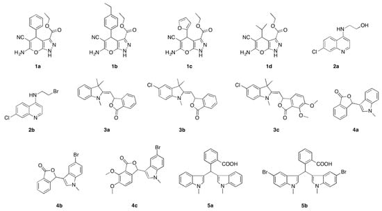 N-heterocyclic compounds that were synthesized in our laboratory are shown in Figure 2. Compounds 1a–d were synthesized following a procedure described in the literature [28] using diethyl oxaloacetate, hydrazine, aldehyde, and malanonitrile, whereas the preparation of quinoline derivatives (2a) have been reported by Bhagat and co-workers [29]. The insertion of a bromine group can be achieved in the presence of hydrogen bromide under a catalytic system to furnish compound 2b following the existing methodology by the group of Aminake [30]. Meanwhile, we recently reported the preparation of phthalide and bisindoles derivatives 3a–c, 4a–c, and 5b [31,32]. These compounds were tested with an electrochemical toxicity DNA biosensor using 24 base guanine-rich: CGG-CGG-CGG-CGG-CGG-CGG-CGG-CGG and methylene blue as a toxicity indicator at various concentrations from 0.0005–0.1 ppm.