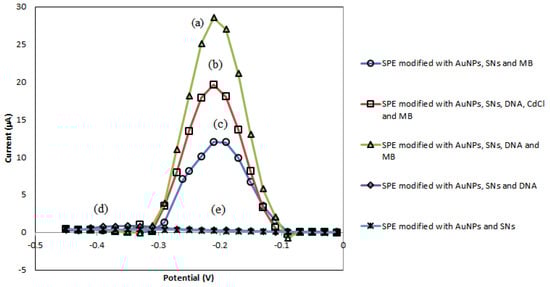(a) SPE modified with AuNPs, silica nanospheres (SNs), DNA and MB. (b) SPE modified with AuNPs, SNs, DNA, cadmium chloride (CdCl) and MB. (c) SPE modified with AuNPs, SNs and MB. (d) SPE modified with AuNPs, SNs and DNA. (e) SPE modified with AuNPs and SNs.