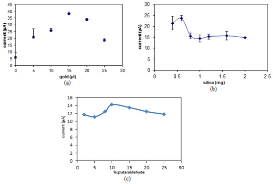 The optimization of the amount of (a) AuNPs, (b) SNs, and (c) glutaraldehyde linkers to be used for the biosensor.
