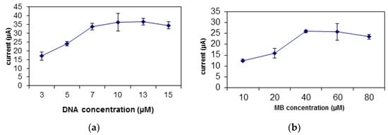 MB plays an important role as redox indicator for the biosensor. There is an increase in the biosensor’s response from MB concentration of 10 µM to 40 µM, which can be related to MB capacity to bind to the DNA (Figure 5b). However, at MB concentration of 40 µM, all binding spaces on the DNA were filled and saturated with MB molecules, thus the biosensor’s response plateaus [40].