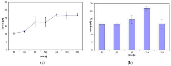 The exposure time needed for MB to bind securely to the DNA was examined between 30 s to 210 s (Figure 6a). The biosensor’s response steadily increases from 30 s to 90 s before hitting a plateau. Thus, the accumulation time for MB molecules to occupy all the binding spaces on the DNA biomolecule was 90 s [41]. Figure 6b shows the time taken for the carcinogen to interact optimally with the DNA. The biosensor response gradually increased from 30 s to 120 s. This clearly shows that the amount of MB still exceeding the amount of carcinogen molecules immobilized onto the SNs. The biosensor response declines after 120 s due to the number of carcinogen molecules bound to DNA exceeding the number of MB molecules. The MB signal will decrease when the MB is unable to bind to the guanine mass and in this case due to the carcinogenic molecules saturated on the electrode surface [42,43].
