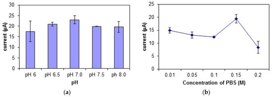 Buffer solution that is acidic or alkaline is not suitable for the DNA biosensor. At a lower pH, the -phosphodiester bonds on the DNA will be deprotonated, thus decreasing the solubility of the DNA. This will cause difficulty in the formation of the DNA and MB complex, hence leading to a decrease in peak signal [44]. There is an increase in the biosensor’s response from pH 6.0 to pH 7.0 and a slight drop at pH 7.5 (Figure 7a). The increase in the biosensor’s response signifies an increase in the binding of MB molecules to the DNA. Thus, pH 7.0 was chosen as the optimum pH for this biosensor.