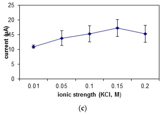 The buffer used in this study is potassium phosphate buffer, PBS with potassium chloride, KCl as its ionic salt. There was an increase in the biosensor’s response shown in Figure 7b,c when the ionic strength and buffer concentration was increased from 0.01 M to 0.15 M. When the concentration of the buffer and its salt exceeds 0.2 M, the DNA may get curled, as there will be an interaction between the negatively charged backbones of the DNA with the counter ions in the buffer. This causes difficulty for the DNA, MB, and carcinogen to interact. However, at an optimum buffer concentration, the presence of cations will help to stabilize the shape of the DNA biomolecule [45]. At ionic salt concentration of 0.15 M, the DNA configuration was quite stable, hence giving easy access to the MB molecules and carcinogen to interact with the DNA.