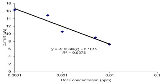 The performance of the biosensor was tested on a heavy metal, cadmium (II) chloride (Figure 8). Cadmium was used in this study as it is a Class 1 carcinogen as classified by IARC. Since this is a confirmed carcinogen, it will have a strong affinity towards oligonucleotides. This is shown during the detection of cadmium (II) chloride using this biosensor where a wide dynamic range between 0.0005 ppm to 0.01 ppm was achieved with good linearity (R2 value of 0.959), sensitivity of 1.31 Δδ current/decade and detection limit of 0.0004 ppm. A DNA biosensor that could detect the presence of cadmium in the range of 1 × 10−6 ppm to 2 × 10−5 ppm and limit of detection of 3 × 10−7 ppm was built using ssDNA rich in adenine and thymine bases that was immobilized on the surface of Au electrode through Au-S covalent binding [46]. This proves that this biosensor gives a good response with carcinogens and is suitable for anti-tumor agent detection.