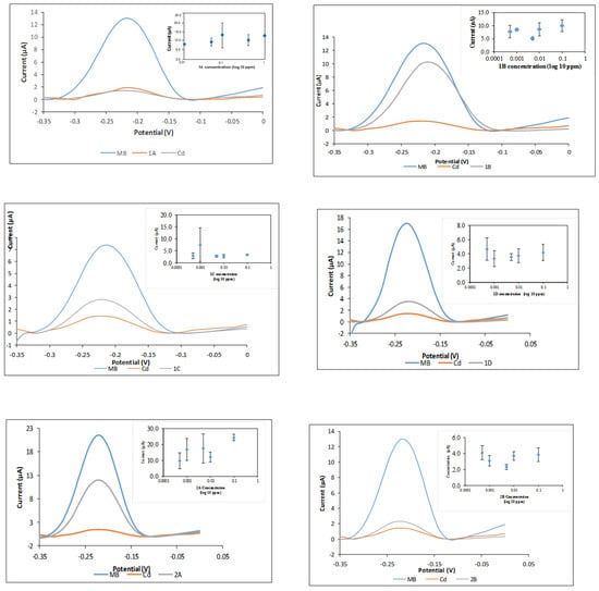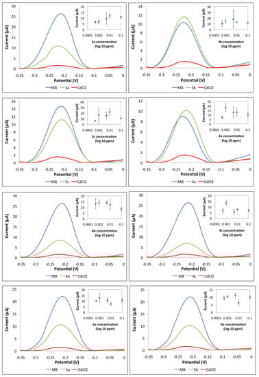 The current signal for compounds 3b and 4a are higher than the MB signal. The resulting current peak was produced because a substantial amount of MB molecules were able to be adsorbed onto the DNA phosphate backbone. Moreover, the tested compounds were not able to bind with DNA and hence, could not be detected by this biosensor. The initial findings suggest that 3b and 4a are non-carcinogenic compounds. On the other hand, the DPV peak for carcinogen sample CdCl2 showed a low current signal. The presence of carcinogens has filled up the binding sites on the DNA which consequently leave less space for the interaction between MB-DNA. All the other compounds tested showed a slightly lowered MB current signal. This initial finding suggests that compounds 3a, 3c, 4b, 4c, 5a, and 5b possess limited carcinogenic properties. Further biosensor performance tests were performed by screening the compounds with various concentrations to validate these initial findings. The insets in Figure 9 demonstrate the current signals of MB with different compound concentrations. Generally, the higher the carcinogen concentration, the lower the current signal. A decreasing trend will be shown on the graph of current signal against compound concentration (inset) if the compound is carcinogenic. However, none of the insets in Figure 10 display such a decreasing trend. In addition, the current peaks showed a relatively large deviations (error bars) considering that the noise has becoming more significant, considering the changes of the signal are very small as there is no binding with the toxicants, hence no competition binding with the MB. It is noteworthy that the response is more stable when there is a binding event. Those compounds indicating toxicity have lower errors compared with those with no toxicity. In the non-binding event, only the baseline signal is evaluated, which is less stable. The results of this investigation show that the DNA biosensor has successfully classified the compounds, into either carcinogenic or non-carcinogenic compounds. Relevant validation and interference studies for this biosensor have been conducted and published previously. This biosensor has been used for formaldehyde detection in mackerel fish extract and acrylamide determination in cassava chip extract. It has been compared with the standard Nash method, standard HPLC-UV method, and Ames test [47].
